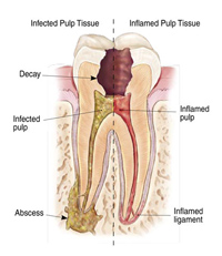 - Khi tủy bị nhiễm trùng có thể tủy chết nguyên nhân do từ một lỗ sâu hay chỗ nứt cho phép vi trùng thấm qua hoặc tổn thương do chấn thương. Tổn thương hay chết tủy gây ra sự gia tăng lưu thông máu và hoạt động tế bào, và áp lực không thể thoát ra từ phía trong răng. Đau trong răng thì thường được cảm thấy khi cắn xuống, nhai trên đó và khi tiếp xúc thức ăn hay nước uống nóng hoặc lạnh.