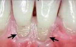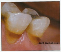 Cổ răng cửa và răng hàm có thể bị mòn thành khía rãnh có hình chữ V ở mặt ngoài và gây nên ê buốt và có thể tiến triển gây viêm tủy răng. Nguyên nhân thường là do chải răng không đúng phương pháp.